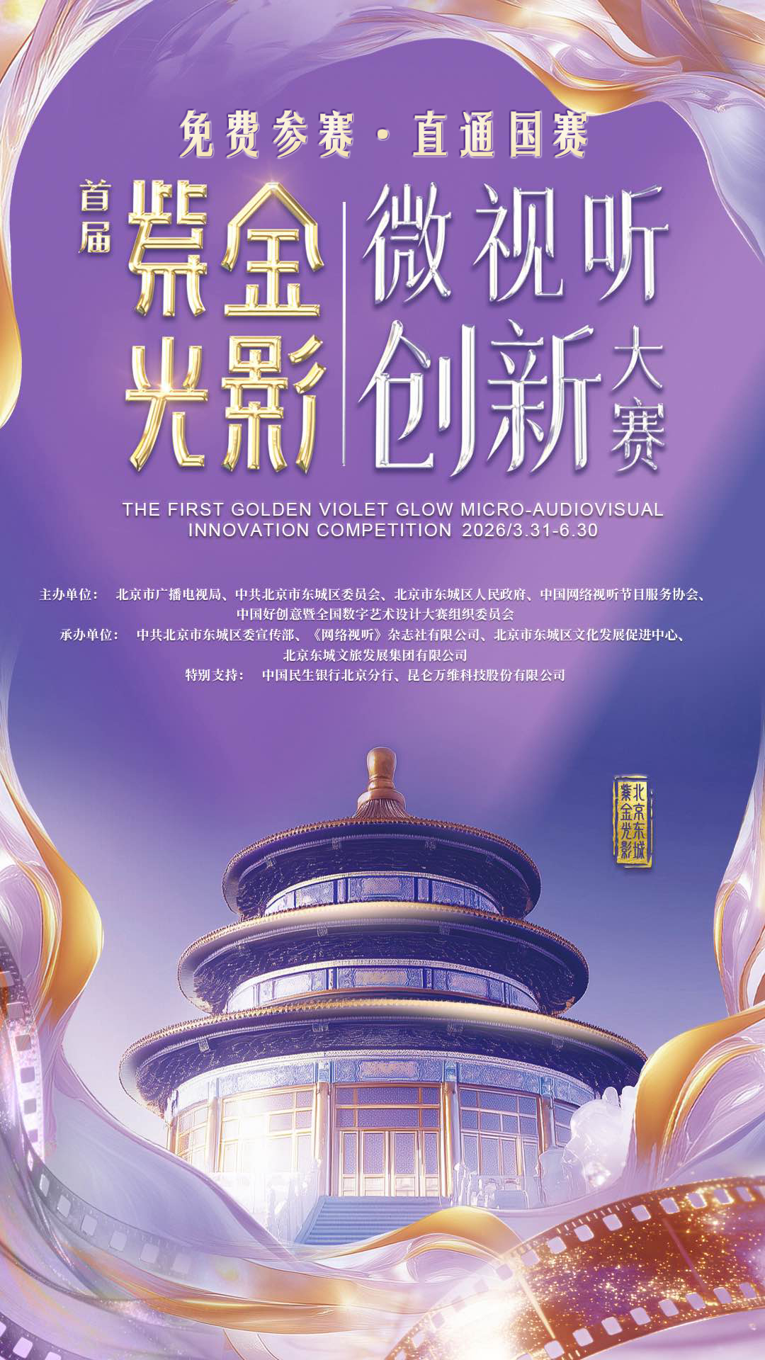 北京市东城区作为文化底蕴深厚、资源富集的全国文化中心核心承载区,以举办本次大赛为契机,明确“以赛引才、以赛促产、以赛聚链、以赛兴业”目标,吸引国内外顶尖制作机构、技术公司、创作人才、投资机构落户东城或建立深度合作,着力打造具有全球影响力的微视听产业高地,做强“东城微视听”产业生态,塑造微视听领域技术革新、前沿展示与文化交流的标志性活动。在方寸银幕之间,见微知著;于紫金光影之下,洞见未来。